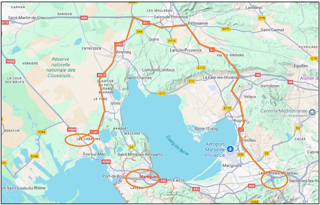 Un itinéraire de déviation 9 grande maille : sera mis en place via l’A7, l’A54 et la RN569 pour ces véhicules de plus de 26 tonnes par le nord de l’Etang de Berre (cf. carte 2 ci-dessous).
