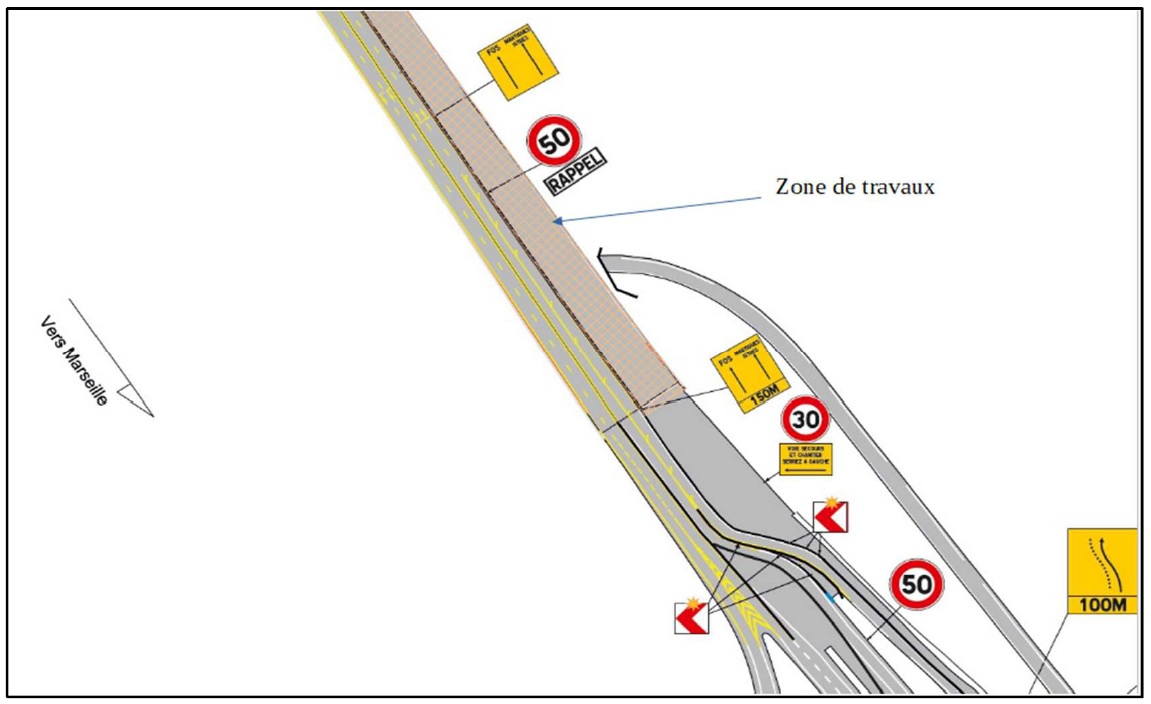 Elle sera maintenue sur les bretelles d’accès et de sortie des deux échangeurs, de part et d’autre du viaduc et limitée à 50km/h dans la zone de travaux.