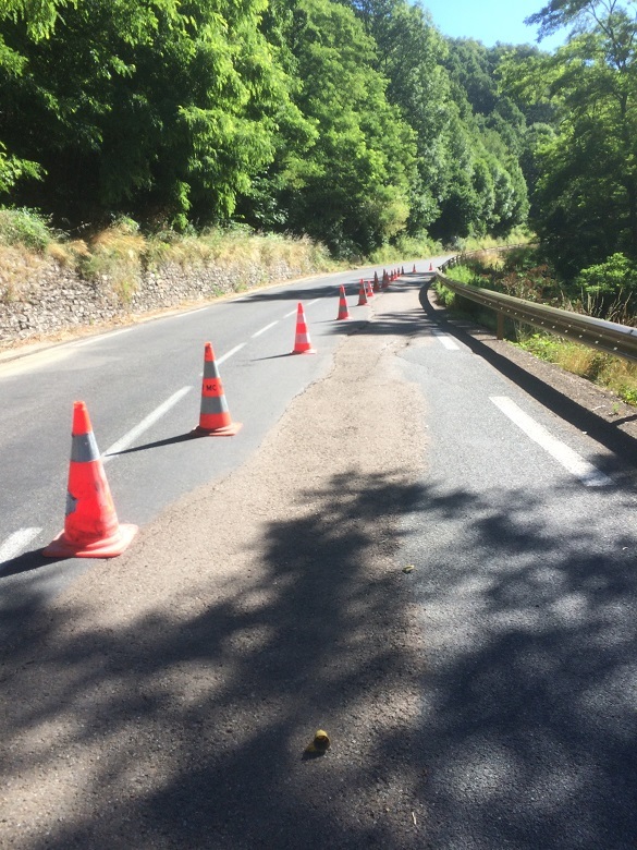 Suite à l’élargissement de la RN 106, un glissement d’ensemble s’est produit,entraînant une fissuration importante de la chaussée dans le sens Florac vers Alès.