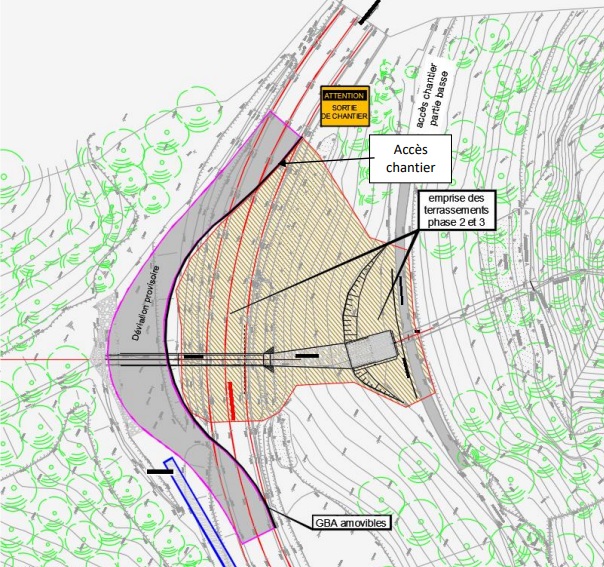 Pour permettre une réalisation des travaux plus aisée et plus sécurisée et limiter la gène aux usagers une déviation provisoire de la route nationale sera aménagée sur le délaissé situé à proximité de l’ouvrage hydraulique.
